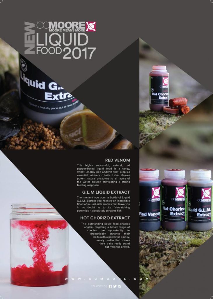 Big Carp Tackle will be carrying the new line of CC Moore Liquid foods which include the Liquid G.L.M. Extract , Red Venom and finally the Hot Chorizo Extract . These will all be available in the coming months and stocked regularly.