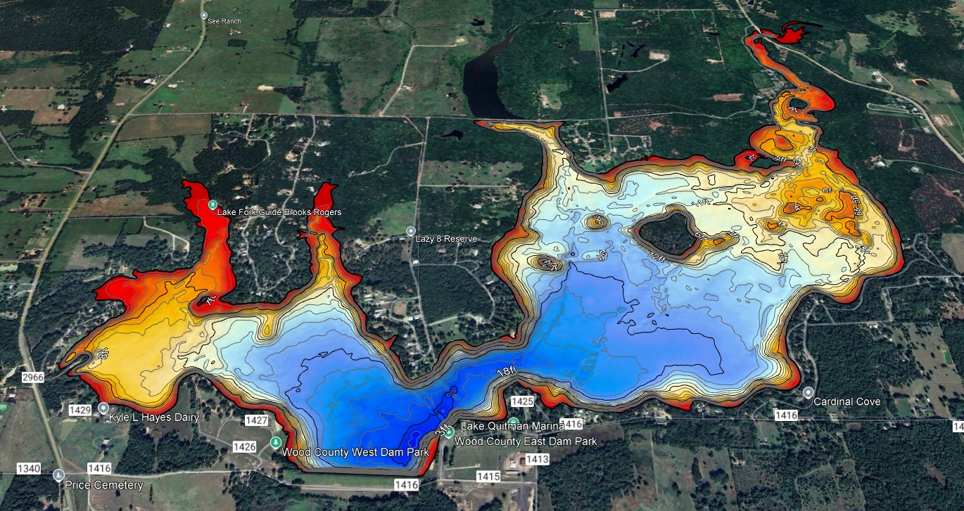 Google Earth is a great way to measure and map locations. The map below is a map that the Texas Parks and Wildlife Department made of Quitman Lake (yes, it has plenty of carp) that you can download and view in Google Earth. There are other map options as well and a search for the name of the lake and “map” will often turn up something that can be a good starting point. A word of caution however – these maps may not be very accurate and your own on-the-ground investigation will often be required to narrow down the areas that are actually best.
