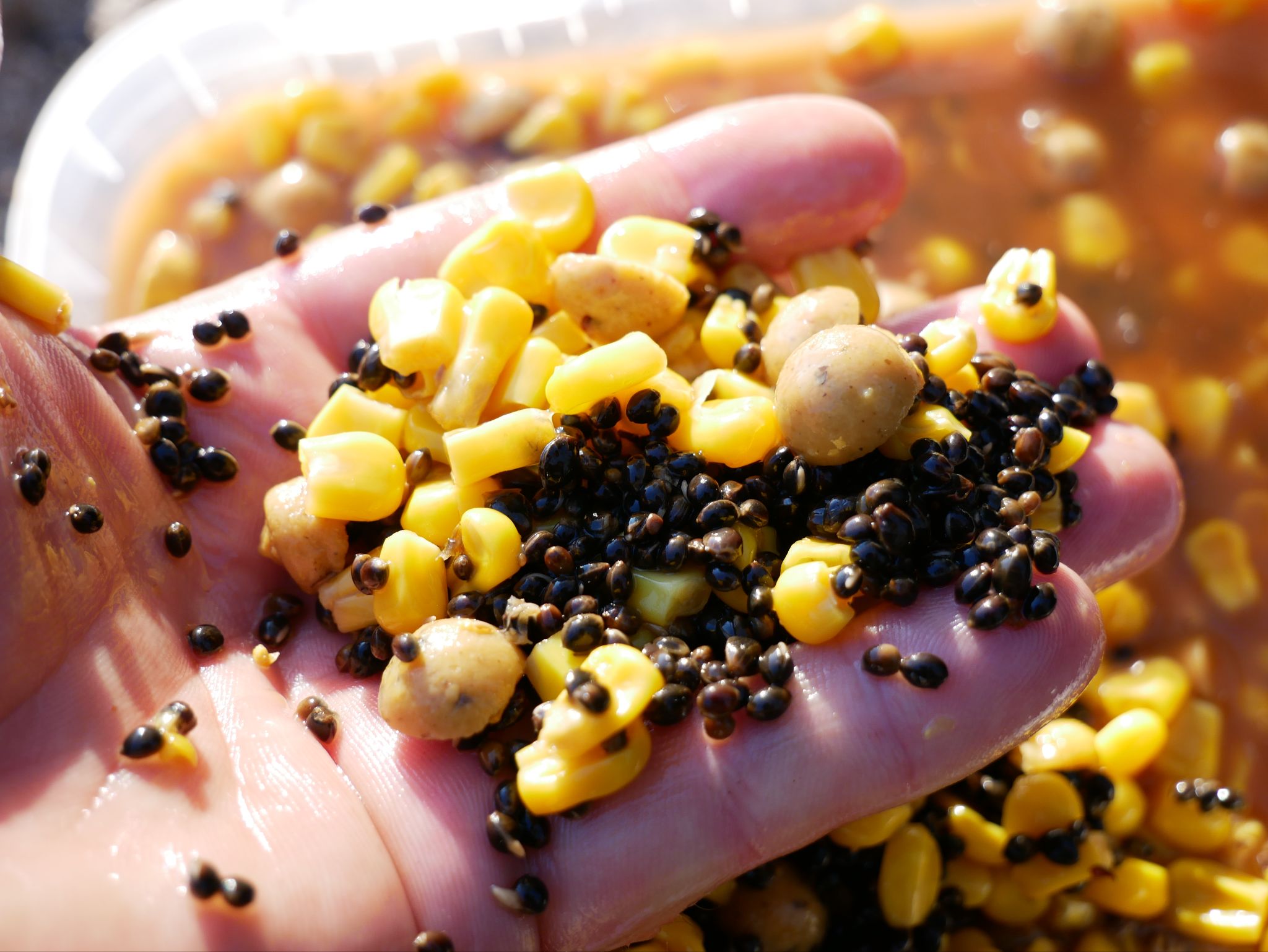 Sweetcorn, hemp and a few chopped up boilies will work on most waters around the world.